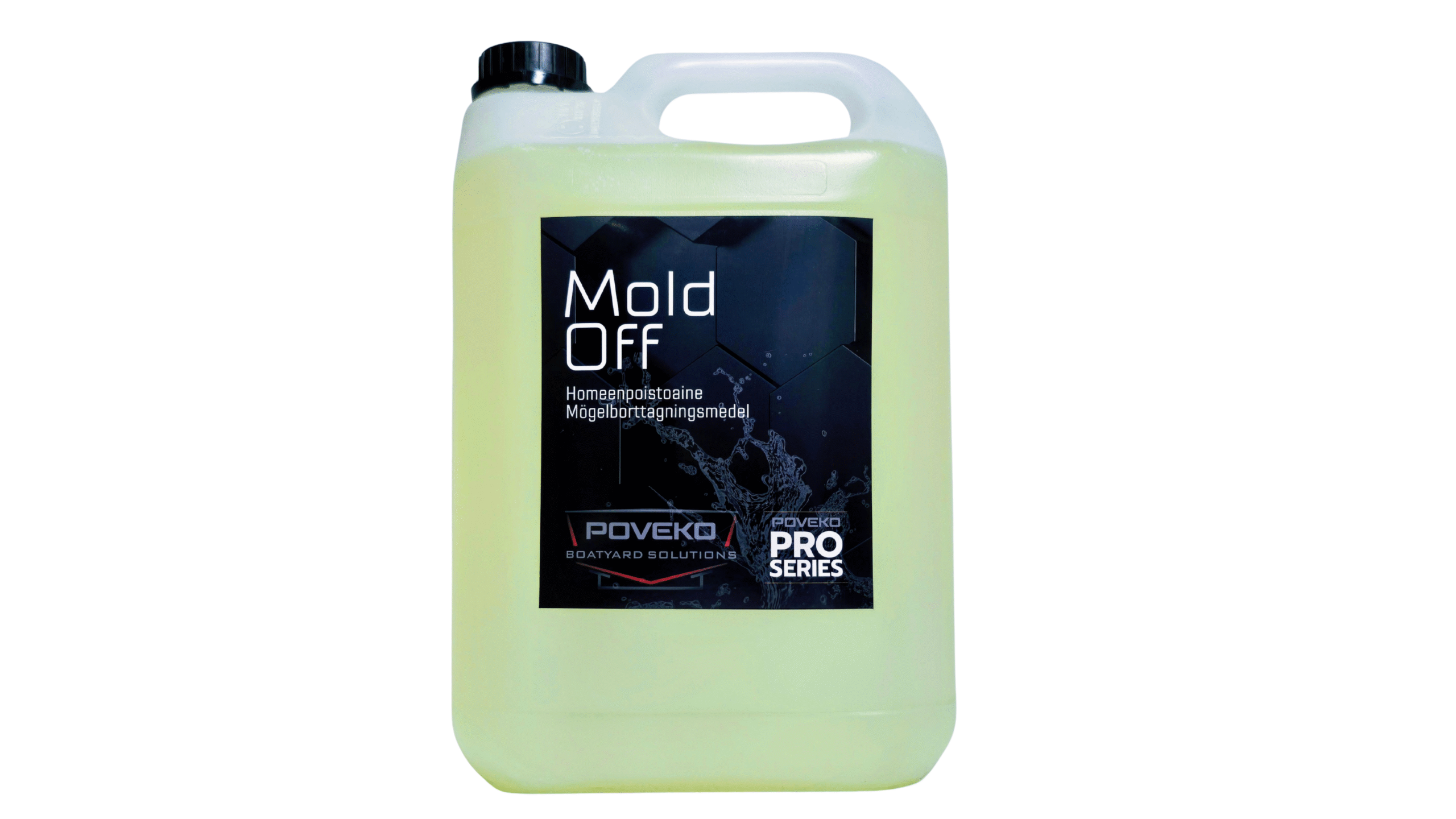 Poveko Pro Series Mold Off on tehokas homeen, mustien pilkkujen, levän ja muun kasvuston poistoon tarkoitettu natriumhypokloriittia sisältävä puhdistusaine, jota voidaan myös laimentaa.